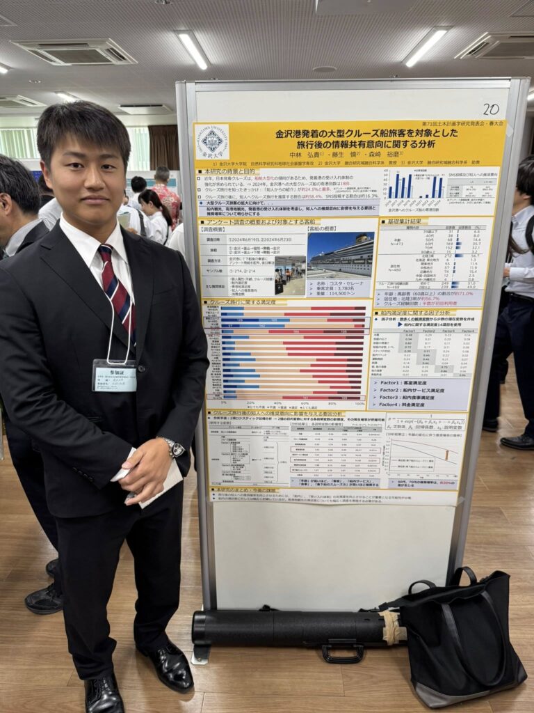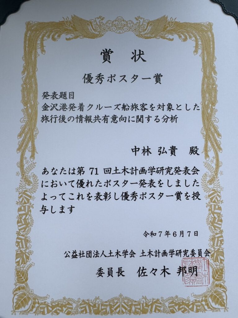 2025.09.18 NEWS 本学学生が学会にて優秀ポスター賞を受賞 2025年6月7日から6月8日にかけて香川大学で開催された第71回土木計画学研究発表会・春大会において、金沢大学大学院自然科学研究科地球社会基盤学専攻の中林弘貴さん(指導教員:藤生慎教授)が優秀ポスター賞を受賞しました。 題目:金沢港発着クルーズ船旅客を対象とした旅行後の情報共有意向に関する分析 優秀ポスター賞